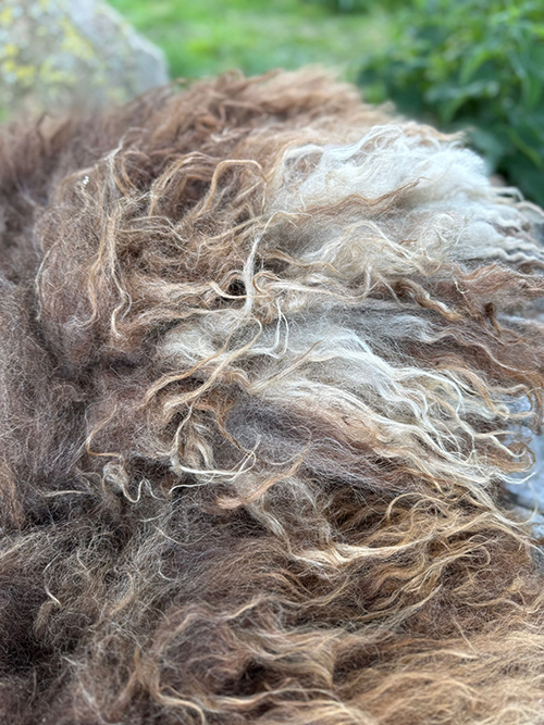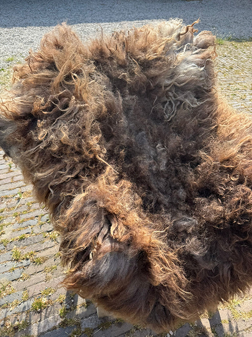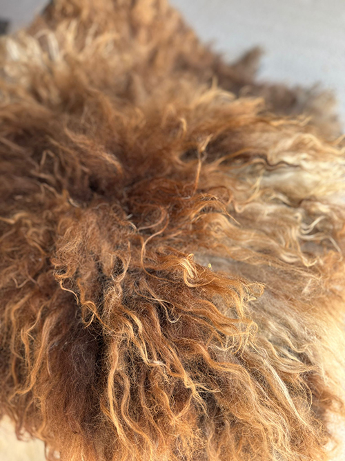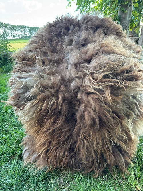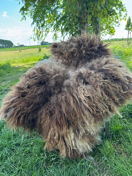 Ook deze vacht is door ons met de hand voorzien van een wollen rug. Er is uiteraard een geschoren vacht gebruikt, het schaap in kwestie maakt op dit moment weer een nieuw vachtje voor volgend jaar.