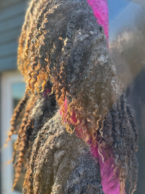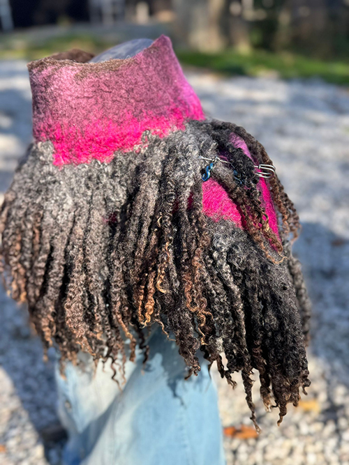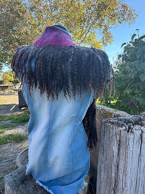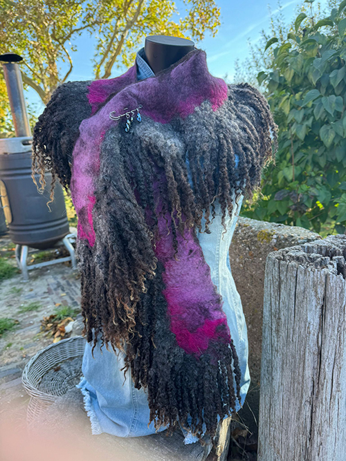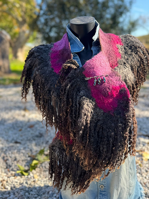 Deze sjaalkraag is een lange sjaal met een ronding erin gevilt zodat deze mooi valt om de kraag van een jas. De vele prachtige ongeverfde wensleydalekrullen in combinatie met het roze/ fuchsia melange aan de hals maken deze sjaal iets bijzonders. De handgemaakte speld is evt bij te bestellen.